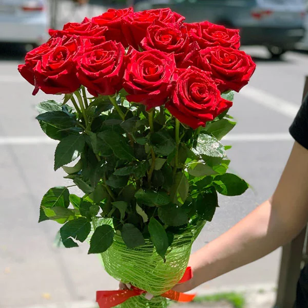 Роза красная 70 см - 11 шт, упаковка, лента. На фото представлен букет из 9 роз.