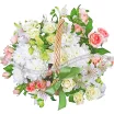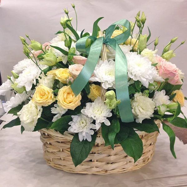 ЛЮКС: хризантема кустовая белая - 5 шт., роза кустовая белая - 4 шт., роза кустовая розовая - 5 шт., эустома белая - 3 шт., альстромерия белая - 5 шт., декоративная зелень, оазис, корзина средняя.