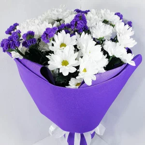 Сочетание ангельски нежных белых и розовых кустовых роз и эустомы в композиции с белыми хризантемами, альстромерией и декоративной зеленью подчеркнет Ваш изысканный вкус.