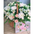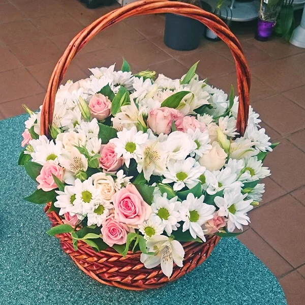 Уменьшенная: хризантема кустовая белая - 2 шт., роза кустовая белая - 1 шт., роза кустовая розовая - 1 шт., эустома белая - 1 шт., альстромерия белая - 2 шт., декоративная зелень, оазис, корзина малая.