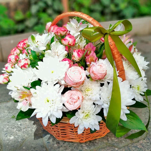 Стандартная (на фото): хризантема кустовая белая - 2 шт., роза кустовая белая - 2 шт., роза кустовая розовая - 3 шт., эустома белая - 1 шт., альстромерия белая - 3 шт., декоративная зелень, оазис, корзина средняя.