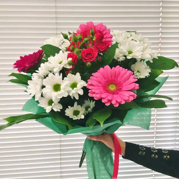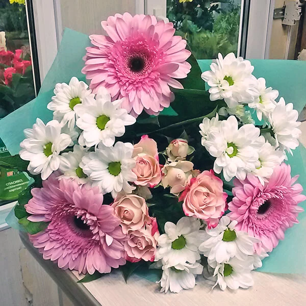 Глоток романтики – букет из кустовой хризантемы и розовых гербер