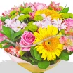Стандартный (на фото): роза розовая - 7 шт, гербера желтая - 2 шт, альстромерия розовая - 4 шт, хризантема кустовая зеленая - 3 шт, хризантема кустовая светлая - 2 шт, рускус, фетр желтый. Примерный размер: 25Х25 см.