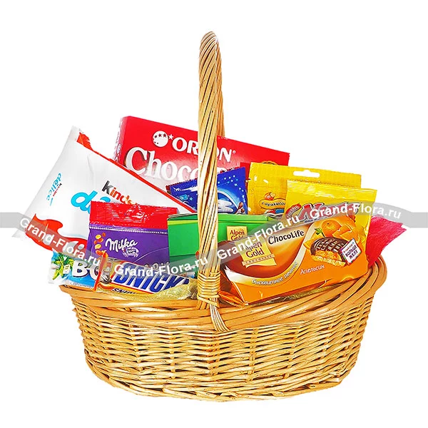 Стандартный (на фото): печенье "Choco-Pie" - 1 уп., драже "Milka" - 1 шт., бисквит "Kinder Delice" - 1 уп., шоколад "MilkyWay" - 1 уп., шоколад "Bounty" - 1 шт., шоколад "Snickers" - 1 шт., шоколад "Alpen Gold" - 1 шт., печенье "Alpen Gold ChocoLife" - 1 шт., шоколад "Nuts" - 1 уп., драже "M&M's" - 1 шт., корзина средняя, декор.