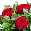 3 розы: роза красная - 3 шт., рускус - 2 шт., эвкалипт - 1 шт., упаковка, бант красный.