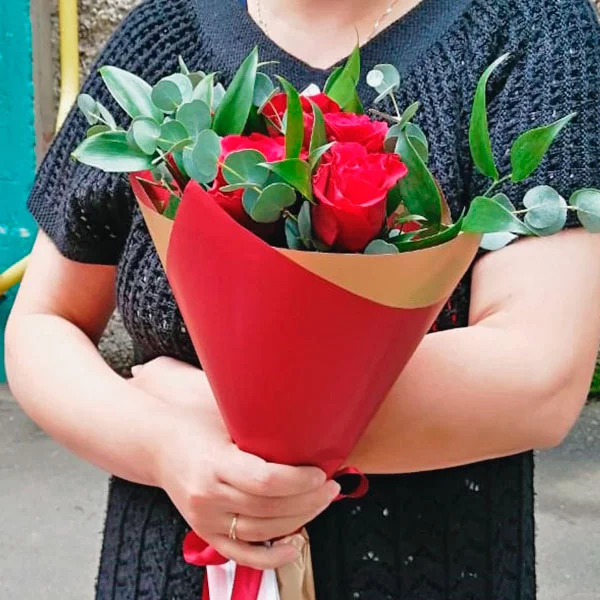 5 роз: роза красная - 5 шт., рускус - 3 шт., эвкалипт - 2 шт., упаковка, бант красный.