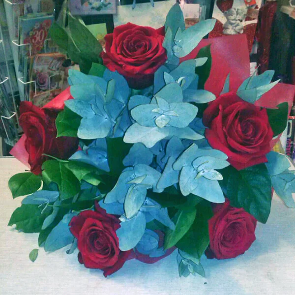 Букет из красных роз, гармонично дополненный рускусом и эвкалиптом, станет отличным поздравлением как для женщин, так и для мужчин.