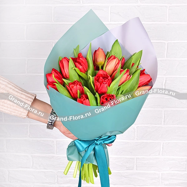 19 тюльпанов: тюльпаны красные - 19 шт, упаковка, лента.