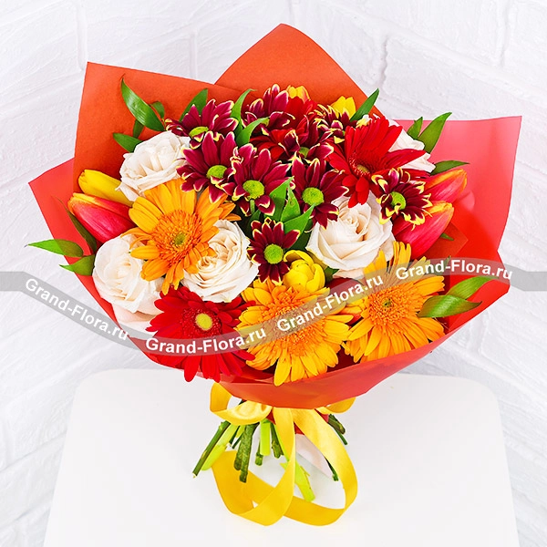 Стандартный: гербера красная - 1 шт., гербера оранжевая - 2 шт.,тюльпан желтый - 3 шт., тюльпан красный - 2 шт., роза белая - 3 шт., хризантема кустовая бардовая - 2 шт., декоративная зелень, упаковка, лента.