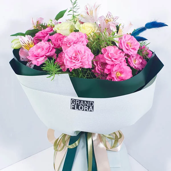 "Элегантная нежность" - это букет из белых роз и розовых альстромерий, который представлен в фирменной упаковке. Белые розы символизируют чистоту, невинность и идеальность, а розовые альстромерии - это символ любви и дружбы, их нежный оттенок делает их идеальным дополнением к белым розам. Кустовые розы создают естественный и живой акцент, добавляя еще больше элегантности и нежности к композиции.