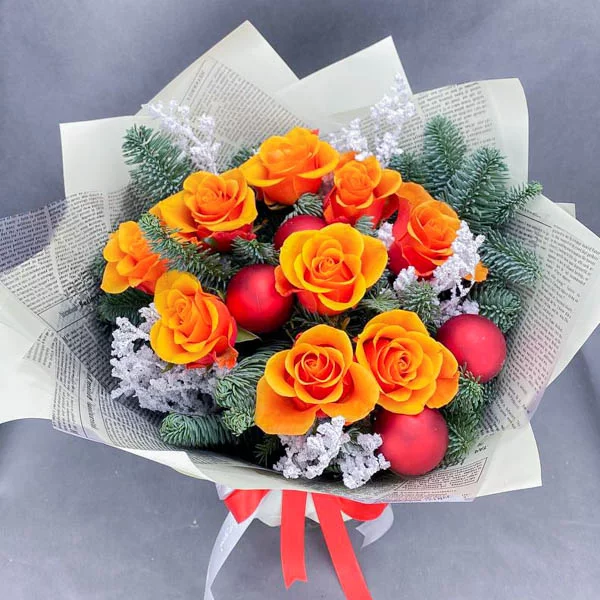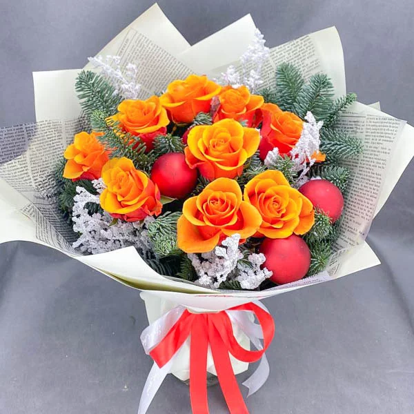 "Яркий праздник" - это красочный букет, состоящий из сочных оранжевых роз, нежных нобилис, манящих елочных игрушек и красивой декоративной новогодней упаковки. Этот букет - идеальный подарок для любого праздника, он напоминает о любви, радости и желании быть рядом друг с другом. Этот букет создаст уютную атмосферу и придаст новогоднему столу неповторимый шарм.